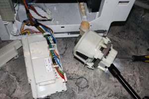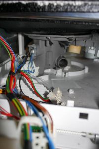Die neuen Kabel anschließen, der neue Motor ist schon eingebaut. Der Geschirrspüler liegt hier auf der Seite…