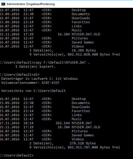 In der Eingabeaufforderung cd \Users\Public eingeben, anschließend die alte NTUSER.DAT vorsichtshalber umbenennen und neue NTUSER.DAT vom anderen Rechner kopieren. Hier sieht man auch die unterschiedliche Dateigröße der ‚defekten‘ NTUSER.DAT gegenüber der neuen.