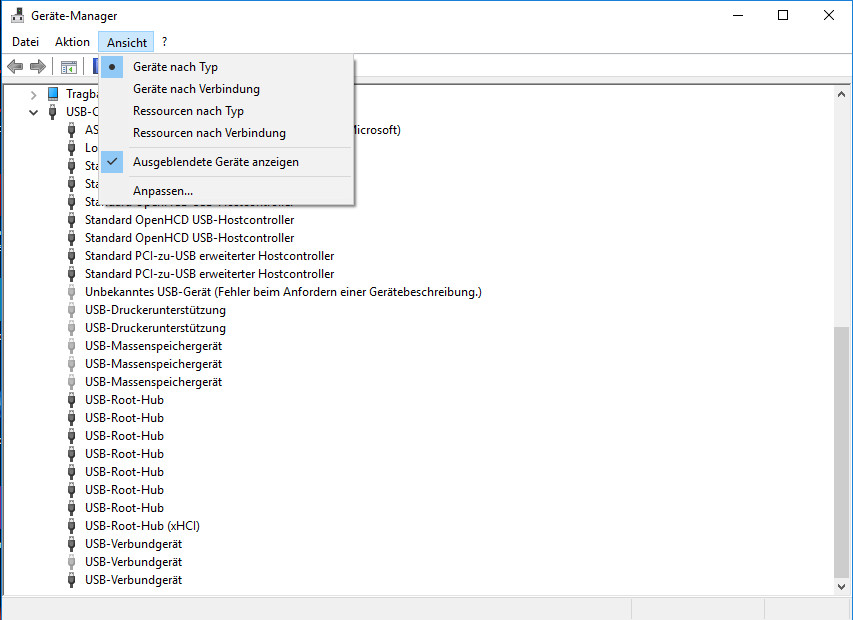 Unter USB-Controller -> Unbekanntes USB-Gerät (Fehler beim Anfordern einer Gerätebeschreibung.) deinstallieren.