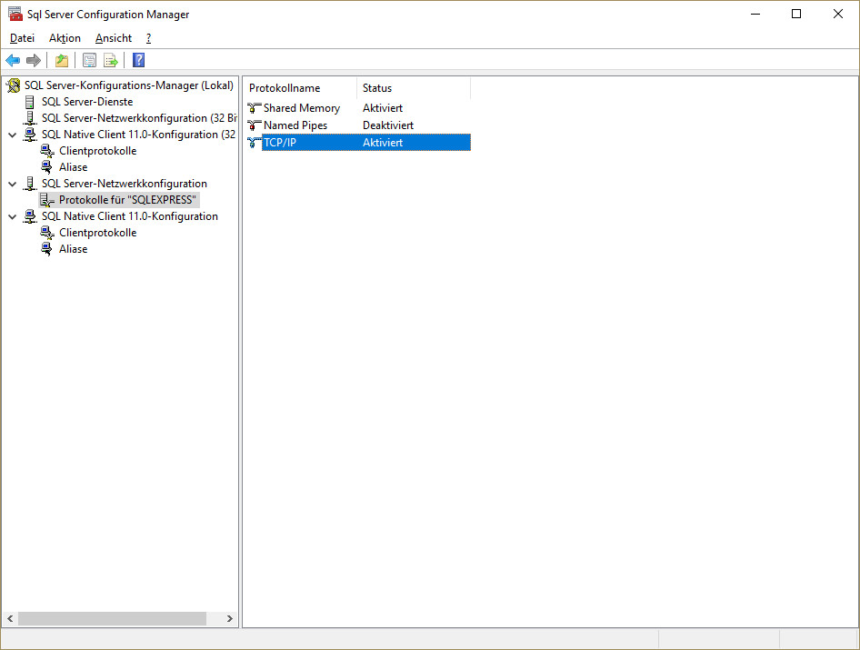 Protokolle für „SQLEXPRESS“ – TCP/IP aktivieren: